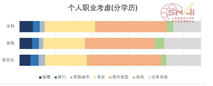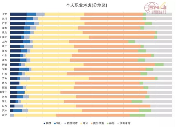 受疫情影響,住宿和餐飲業的財會人員對職業發展的考慮是最多的(人均有1.84個考慮),而且考慮跳槽的體例也是最高的,有24.7%;考慮轉行的也是最多的,有12.3%。一個行業的財會人員大規模的考慮跳槽和轉行,這需要個人、企業、政府多方面的協同努力。