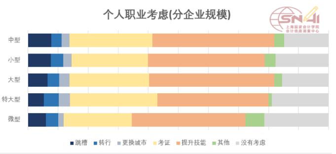 特大型企業的財會人員考慮最多,人均考慮了1.73項職業發展方式;微型企業的財會人員則只考慮了1.45項。
