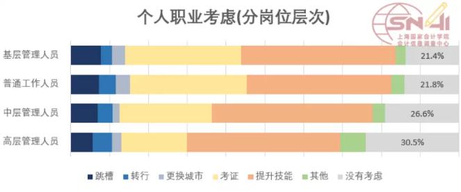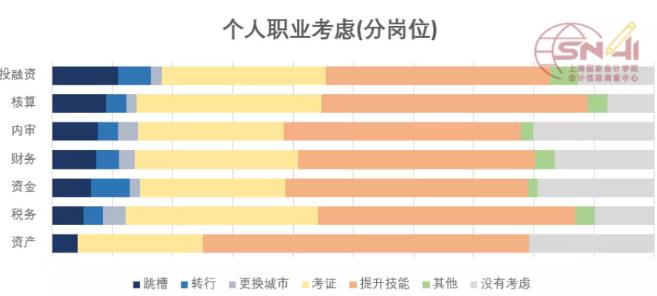 投融資和核算類人員跳槽的意愿最為強烈。核算崗位人員有強烈的職場提升的意愿,考證和提升技能的意愿都最強。這個結果和2019年11月上海國家會計學院發布的《企業會計的未來》調查報告觀點是相互呼應的。在該報告中有這樣的觀點:未來5-10年,普通的“會計核算”職能的重要性要大幅度降低;在企業會計人能力建設中,“會計核算”的需求也比較小。