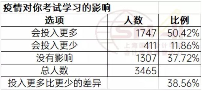 企業財會人員的考試學習意愿與考試學習的條件、環境,個人的職業規劃等因素密切相關。本次疫情顯著影響了企業財會人員對于考試學習的意愿,50.42%的人表示自己會投入更多,11.86%會投入更少,前者比后者要多38.56個百分點。