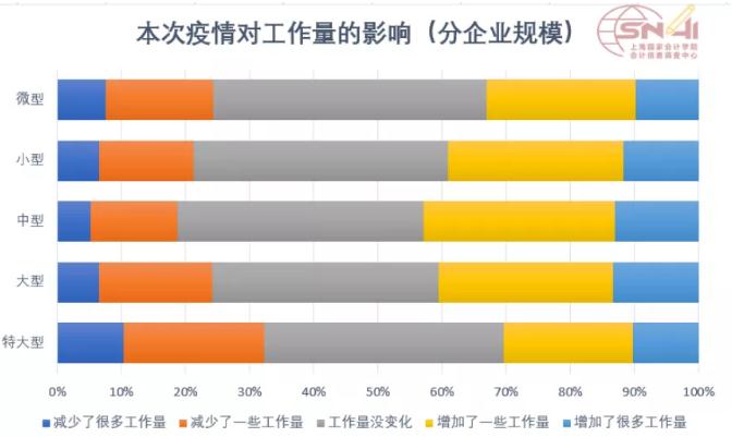 疫情對企業財會人員工作量的影響,特大型企業的財會人員工作量總體是減少的——30.5%的人增加了工作量,32.2%減少了工作量,前者比后者還少1.7個百分點。