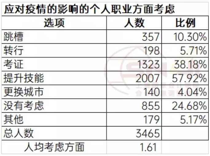 受新冠肺炎疫情影響,有四分之三(75.32%)的人對自己的職業規劃應對有所考慮。在跳槽、轉行、考證、提升技能、更換城市、其他等6個候選項中,人均有1.61選擇。選擇提升技能、考證是最多的。選擇更換城市的人最少,只有4.04%。