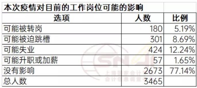 疫情對大部分企業財會人員崗位沒有影響。有12.24%的企業財會人員預計自己可能失業,預期并不一定是現實,但特別值得預警。