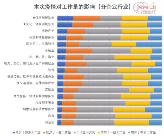 住宿和餐飲業(15.1%)和文化、體育和娛樂業(14.4%)企業財會人員工作量減少很多,這是被疫情沖擊最直接的兩個行業。