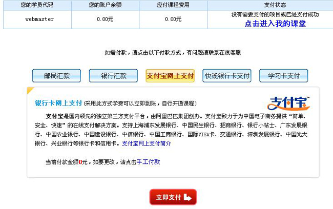 選擇好想要學習的課程后根據提示進入學費支付頁,網校為您提供郵局、銀行、支付寶、快錢銀行卡和學習卡這五種支付方式,可以根據您個人的習慣選擇相應的支付方式進行學費支付。