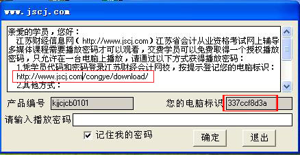 第二步:拷貝到家里的電腦上,(可以通過U盤、硬盤拷貝)。在家里的電腦上打開下載的課程。彈出頁面后,記下提示的電腦標識,在能夠上網的電腦上按照操作提示,登記在家里記錄的電腦標識。等待1個小時后收到課程播放密碼,記錄下來。