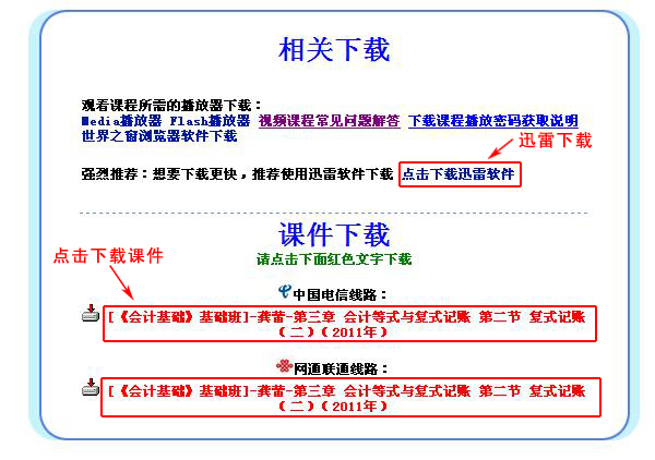 1.進入課程下載頁面。以會計基礎基礎班為例,點擊課程中的“下載”字樣進入下載頁面。