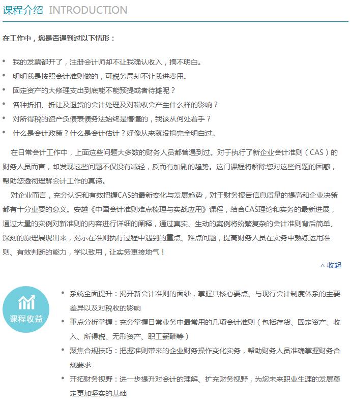 結合CAS理論和實務的最新進展,以及大量的實例對準則的重點難點進行詳細梳理,學以致用,讓實務更接地氣! 安越《中國會計準則難點梳理與實戰應用》課程,將結合CAS理論和實務的最新進展,通過大量的實例對新準則的內容進行詳細的闡釋,通過真實、生動的案例將紛繁復雜的會計準則背后簡單、深刻的原理展現出來。