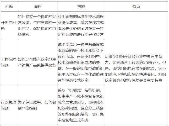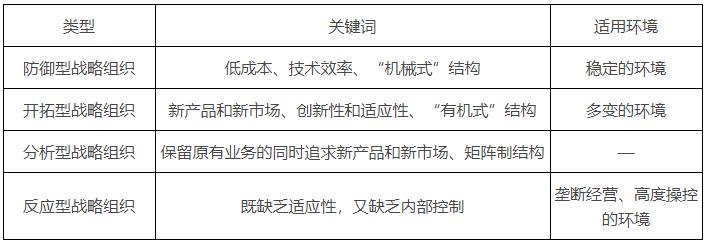 根據一個組織在解決開創性問題(如何管理產品及市場份額)、工程技術問題(如何執行解決開創性問題的方案)與行政管理問題(如何設計組織架構以適應解決前兩個問題的需要)時采用的思維方式和行為特點(戰略傾向),可以將組織分為四種類型:防御型戰略組織、開拓型戰略組織、分析型戰略組織和反應型戰略組織。前三種戰略組織都有與其市場和能力相適應的戰略,而第四種戰略組織卻通常是一種失敗的組織類型。