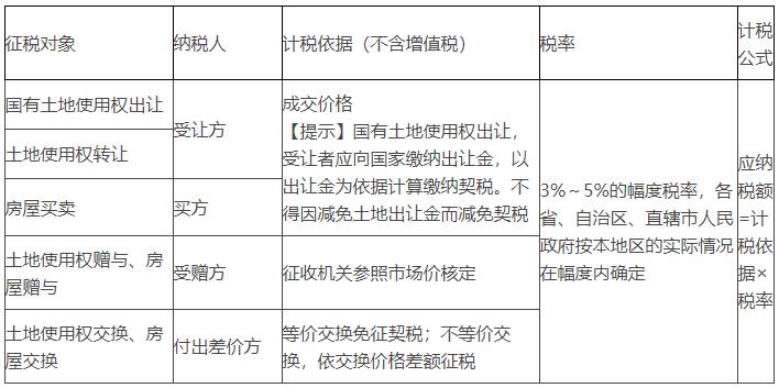 國有土地使用權出讓 | 受讓方 | 成交價格 【提示】國有土地使用權出讓,受讓者應向國家繳納出讓金,以出讓金為依據計算繳納契稅。不得因減免土地出讓金而減免契稅 | 3%~5%的幅度稅率,各省、自治區、直轄市人民政府按本地區的實際情況在幅度內確定 | 應納稅額=計稅依據×稅率 |