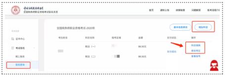 科目增加與科目調換的操作相似,不過這次同學們在選擇加報科目的同時,需要填寫好個人或單位的發票信息并進行交費。稅務師補報名的考試費用為每科98元。