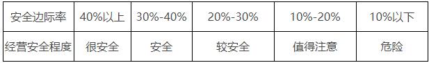 通常采用安全邊際率這一指標來評價企業經營是否安全。下表為安全邊際率與評價企業經營安全程度的一般性標準,該標準可以作為企業評價經營安全與否的參考。