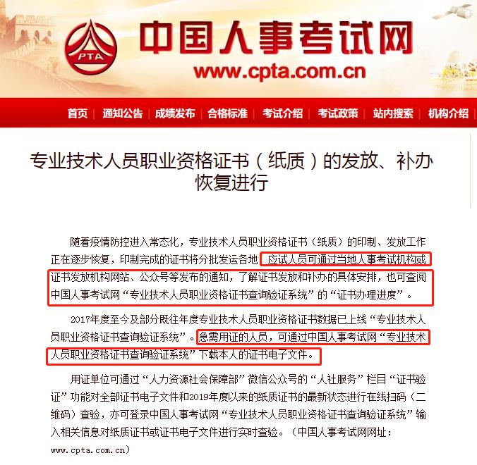 隨著疫情防控進入常態化,專業技術人員職業資格證書(紙質)的印制、發放工作正在逐步恢復,印制完成的證書將分批發運各地,應試人員可通過當地人事考試機構或證書發放機構網站、公眾號等發布的通知,了解證書發放和補辦的具體安排,也可查閱中國人事考試網“專業技術人員職業資格證書查詢驗證系統”的“證書辦理進度”。