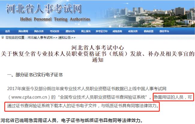 2017年度至今及部分既往年度專業技術人員職業資格證書數據已上線“專業技術人員職業資格證書查詢驗證系統”。急需用證的人員,可通過中國人事考試網“專業技術人員職業資格證書查詢驗證系統”下載本人的證書電子文件。