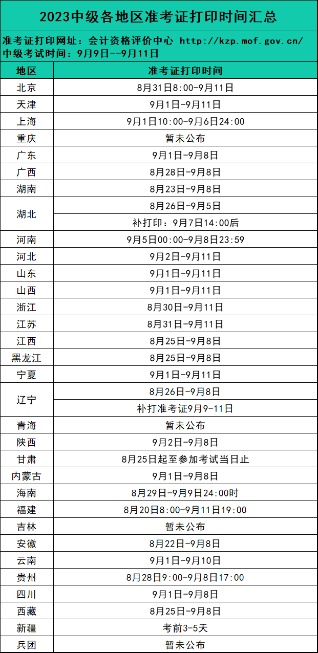 各地區準考證打印時間如下👇