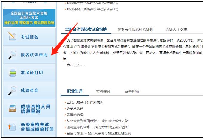 第一步:登錄全國會計資格評價網kzp./首頁,點擊左側“報名狀態查詢”按鈕進去!