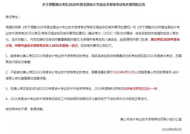根據財政部《關于調整2020年度全國會計專業技術資格考試考務日程安排及有關事項的通知》和《關于調整2020年度全國會計專業技術資格考試(河北考區)考務日程安排及有關事項的通知》(冀會考辦〔2020〕5號)文件精神,結合目前我市疫情防控進入常態化,但外防輸入、內防反彈的任務依然繁重等具體情況,為保障所有考生的人身安全,經報請相關部門批準,唐山考區2020年度會計初、中級專業技術資格考試并入2021年度統一進行。現將有關事項公告如下。