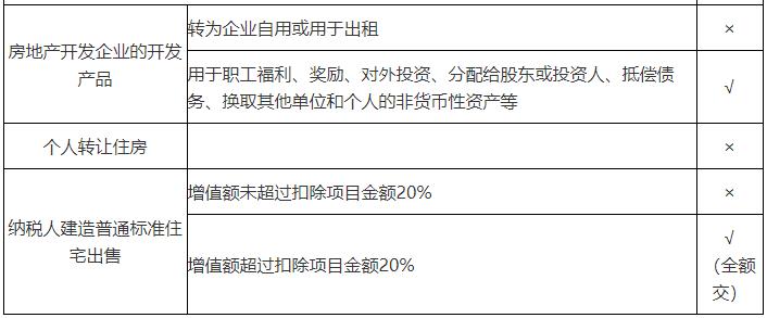 (1)納稅人建造普通標準住宅(不包括高級公寓、別墅、度假村等)出售,增值額未超過扣除項目金額20%的,予以免稅;超過20%的,應按全部增值額繳納土地增值稅。