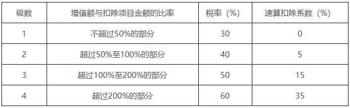 4. 確定適用稅率及速算扣除系數。土地增值稅實行4級超率累進稅率,稅率表如下: