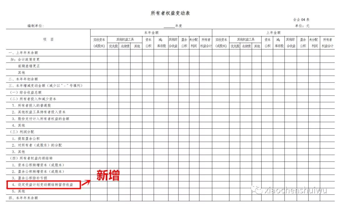 (三)所有者權益變動表主要落實《〈企業會計準則第9號——職工薪酬〉應用指南》對于在權益范圍內轉移“重新計量設定受益計劃凈負債或凈資產所產生的變動”時增設項目的要求: