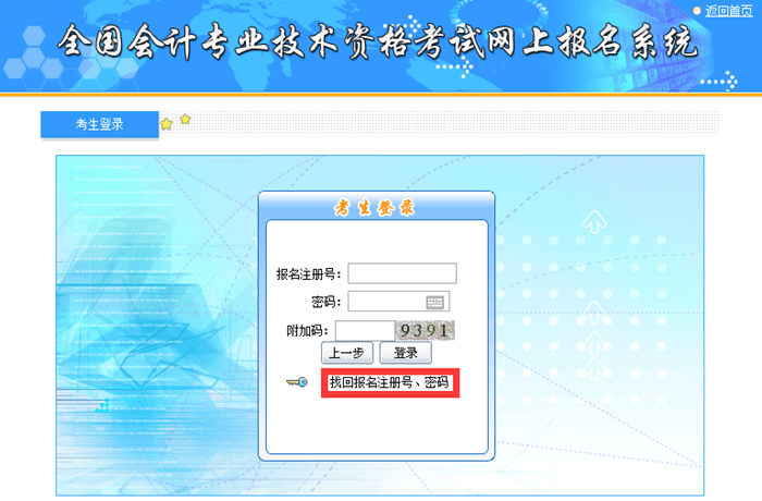 1、進入2019年初級會計職稱考試官方報名入口,在“考生登錄”頁面點(dian)擊(ji)“找回報名注冊號、密碼”。