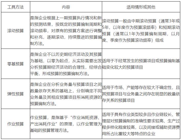 預算管理領域應用的管理會計工具方法,一般包括滾動預算、零基預算、彈性預算、作業預算等。
