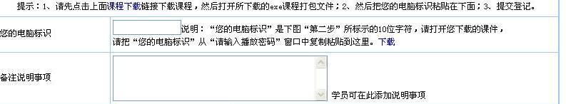 第二步:拷貝到家里的電腦上,(可以通過U盤、硬盤拷貝)。在家里的電腦上打開下載的課程。彈出頁面后,記下提示的電腦標識,在能夠上網的電腦上按照操作提示,登記在家里記錄的電腦標識。等待1個小時后收到課程播放密碼,記錄下來。