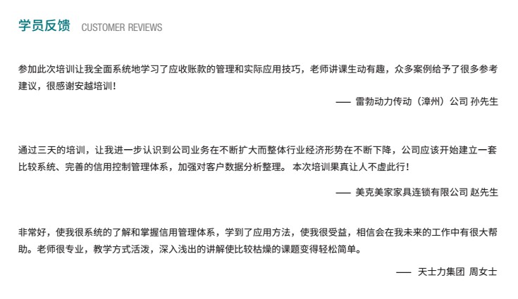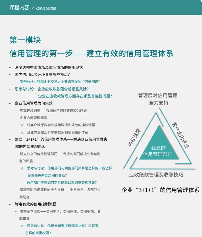 課程收益: 掌握應收賬款管理與欠款催收的具體方法與技巧 制訂合理的賒銷政策,準確評估客戶賒銷風險,合理確定賒銷額度 樹立全員風險意識,建立企業信用管理體系,掌握信用管理工具