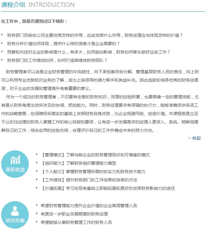 全方位對標財務經理的職業能力,財務經理人進階首選課程。 安越《卓越財務經理訓練營》課程,立足于讓初任經理的財務人掌握工作的核心技能和要領,讓有進一步發展需求的經理人更深入、系統、明晰地理解自己的工作,結合實用的經驗總結,合理評價自己的工作并確定未來的努力方向。