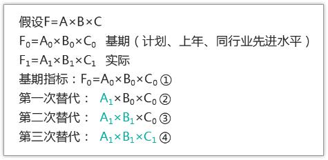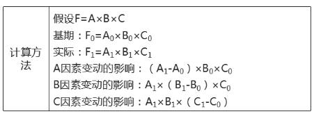 計算某一個因素的影響時,必須把公式中的該因素替換為實際與計劃(或標準)之差。在括號前的因素為實際值,在括號后的因素為計劃值。