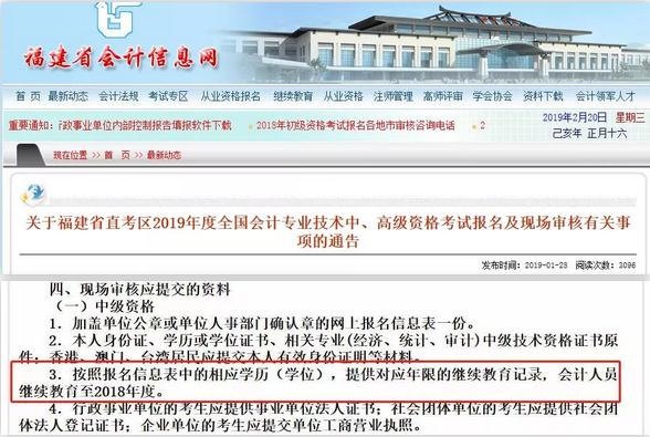 特別提示:目前,發現福建南平、福建寧德地區報名簡章中并未要求提供繼續教育證明,其他市區則尚未收到相關通知,建議福建其他地區的考生查看當地會計網站或電話咨詢當地財政局,提前做準備。