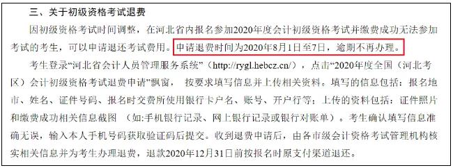 1、各個地方相繼發布會計職稱考試考務通知,不少地方都可以申請退費、延考,但是有截止日期,考生必須在截止日期之前申請,逾期作廢;