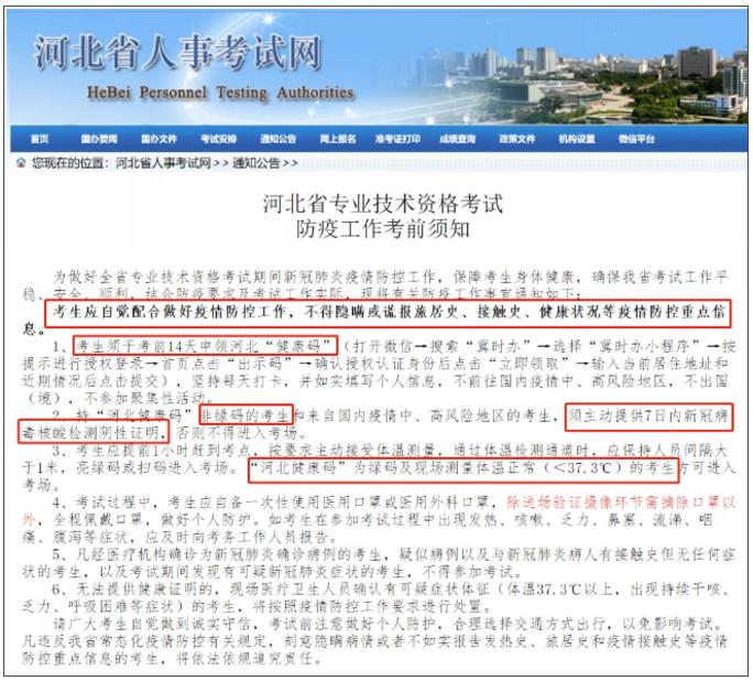 2、持“河北健康碼”非綠碼的考生和來自國內疫情中、高風險地區的考生,須主動提供7日內新冠病毒核酸檢測陰性證明,否則不得進入考場。